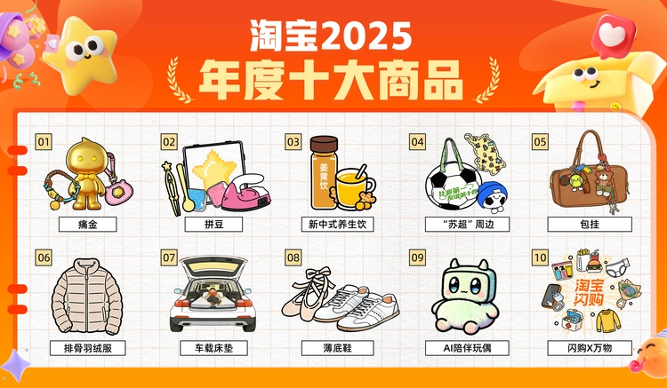 2025年12月18日、淘宝(タオバオ)は2025年の10大ヒット商品を発表した。痛金、アイロンビーズ、バッグチャーム、新中国式栄養ドリンク、薄底シューズ、車中泊スリーピングマット、排骨ダウンジャケット、AIコミュニケーションロボット、蘇超(江蘇省サッカーリーグ)応援グッズなどが選出された。